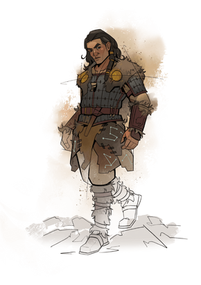 The look: Barbarian fantasy meets Mongolian steppe. Practical, well-fitted clothing in neutral tones (browns, greens, ochres), sturdy leathers, furs, feathers, and wrap-coats. Mantles that blend with their beast partners. Celtic knotwork and constellation motifs.