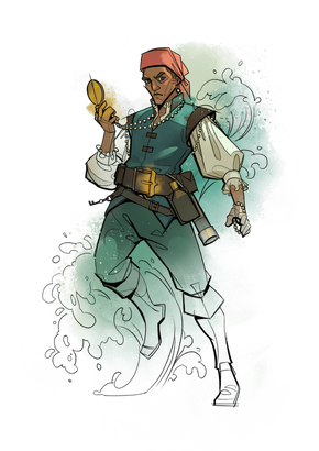 The look: Age of Sail glamour (1560s-1700). Baggy-sleeved white shirts, tight doublets, pearls everywhere, knee-length breeches, and gathered skirts. Sea colours (deep petrol-grey, lush greens, corals) in luxurious brocades and silks. A people who wear their wealth on their sleeves.