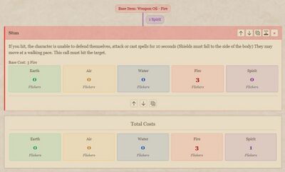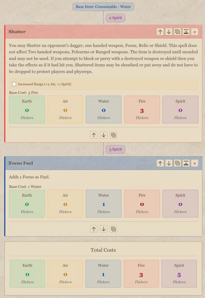 To work out the cost for a Consumable you begin by choosing whether you are making a Consumable or Weapon Oil. These are aligned to different elements (Water for Consumable and Fire for Weapon Oil). Next you choose the effects. Each effect has an alignment of its own (Fire, Earth, Air, Water and Spirit) and a cost in Flicker. E.G Shatter: 3(E) This tells you that to create a consumable with the Shatter effect you will need 3 Fire Flicker.