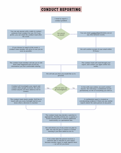 Outside of events, the team will need to collate information, which may involve waiting for people to reply to emails. The team will also need to hold regular meetings to discuss conduct cases. If you report an incident between events, the conduct team will send an acknowledgement that they have received it. If we are dealing with any report between events we can update you until the matter is concluded.