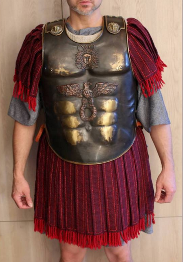These are Roman Galea helmets, metal Lorica Segmentata and Pterges or Singulum which fall only from the front of the belt.