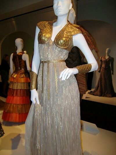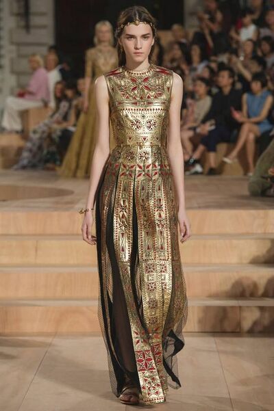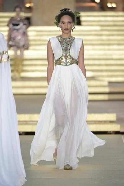 High fashion and modern fashion clothing with classical influences; long draped sleeves and veils, sleek lines and gold belts and other jewellery.