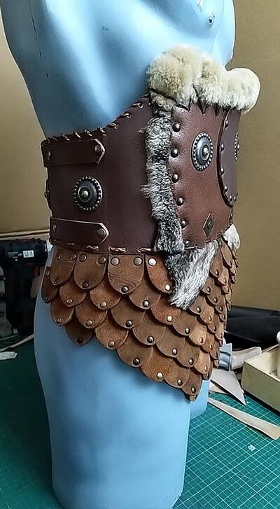 These are often made from scraps, built up over time, with the ragged edges of the materials used left unhemmed and asymmetrical. Usually when a much-loved piece of armour or clothing reaches the end of its useful life, parts of it are incorporated into the warskirt of the original wearer or made up into a new one to be passed on to someone else.