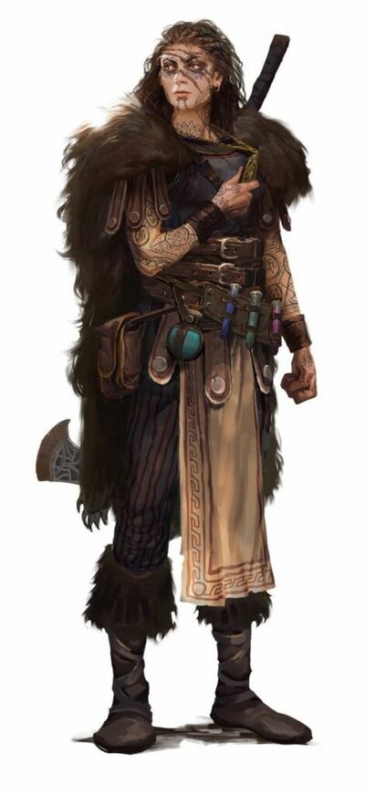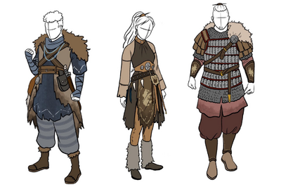 Inspiration has been taken from real-world sources such as Ancient Scythians, the Mongol Empire, Rus warriors, and media inspired by them, especially the fantasy Barbarian trope. Clothing is often made from materials they have to hand – leather and fur from their pack animals or their prey, with feathers, antler and other tokens used as decoration1. Other fabrics are often undyed or in natural colours – browns, beiges, soft greens and blues, and decorated with painted motifs.